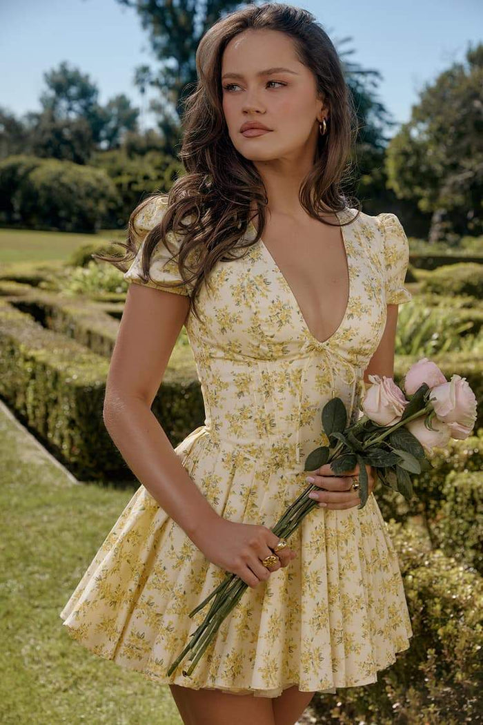 Step into elegance with the Camellia Floral Puff Sleeve Mini Dress, a perfect combination of romance and modern sophistication. Designed to highlight your femininity, this stunning dress features statement puff sleeves and a deep V-neckline, striking the perfect balance between bold and graceful. The flared skirt adds movement and charm, while the delicate floral print enhances its timeless appeal.