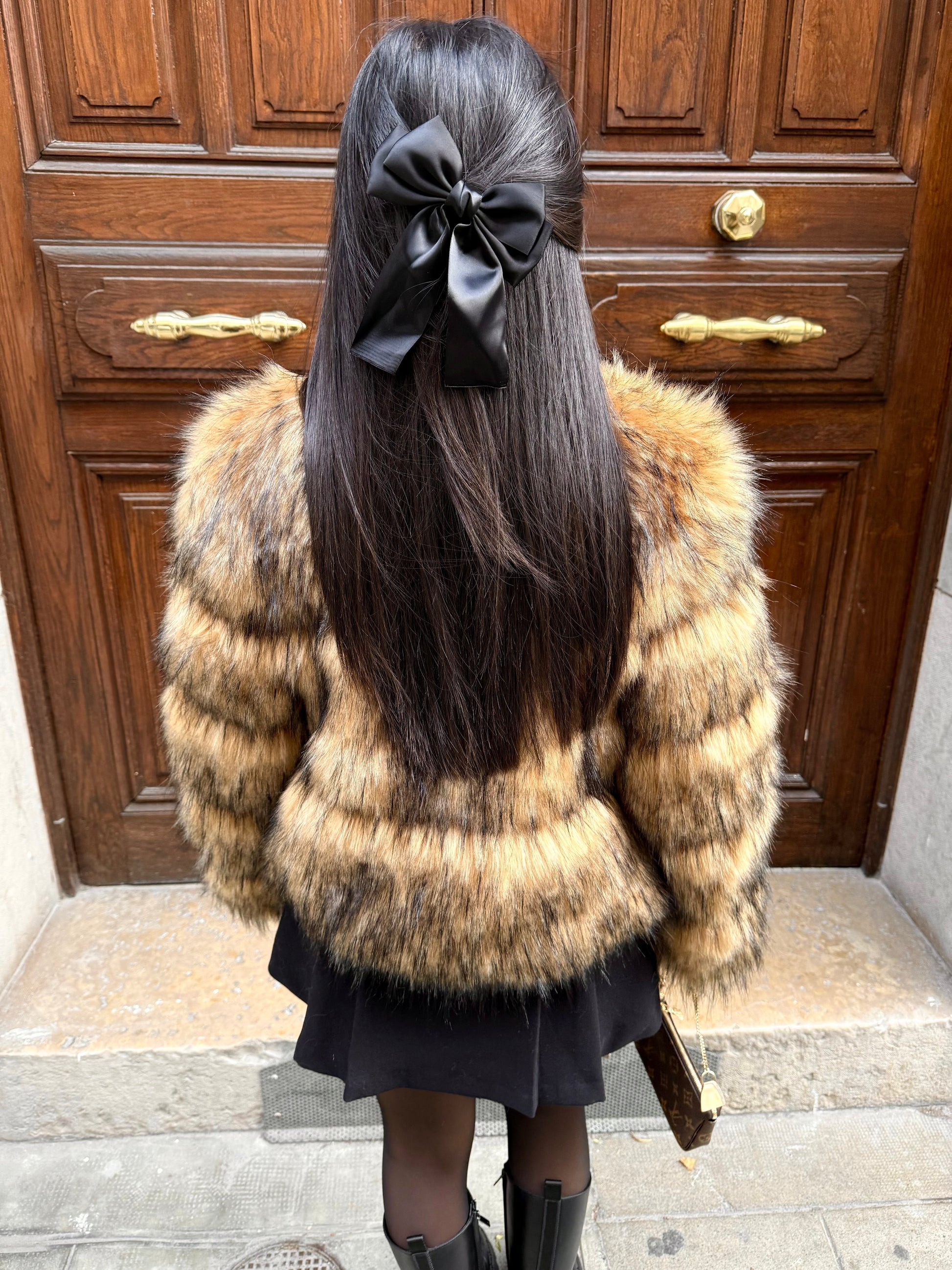 This chic, faux fur-trimmed jacket is perfect for adding a touch of elegance and warmth to any outfit. Featuring a stylish wrap design with a tie waist, it offers a flattering fit while keeping you cozy. The soft faux fur accents on the sleeves elevate the look, making this jacket ideal for both casual and more sophisticated occasions. Whether paired with sleek trousers or a dress, this versatile piece is an essential for any wardrobe. Its cozy yet refined look makes it an excellent choice for autumn and winter outings.