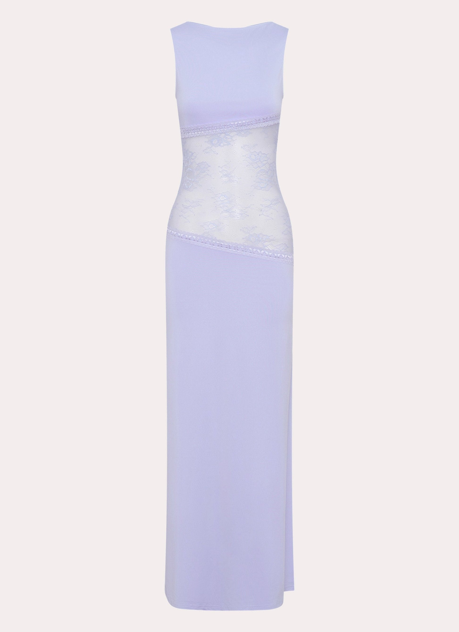 - High rounded neckline, the perfect Maxi length, sexy back cut out. - Self-lined bodice and skirt, Stretch jersey and lace, semi-sheer waist, back hook and eye. - 95% Polyester, 5% Spandex
