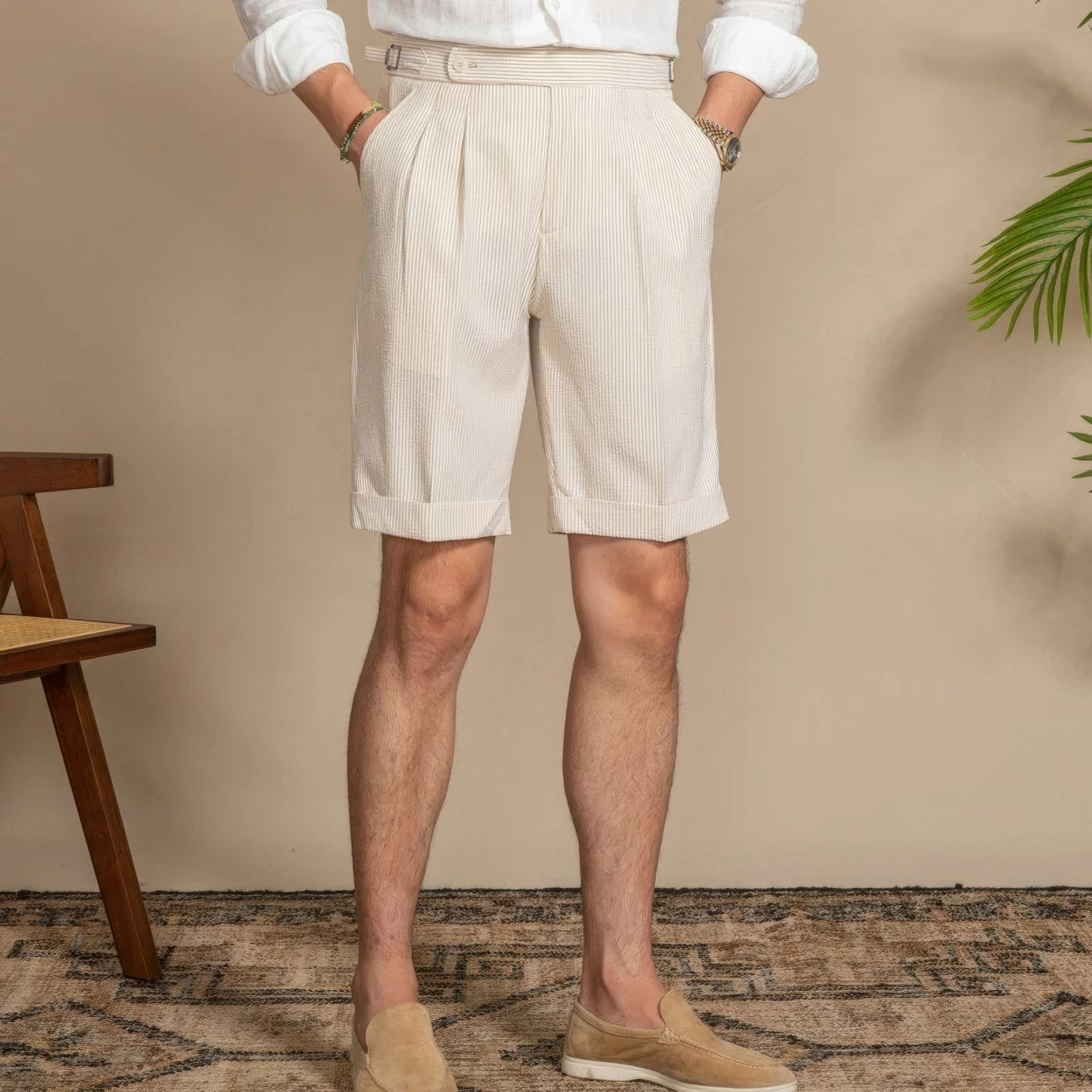 These Seersucker short pants are designed for a stylish and comfortable summer look, perfect for casual or club settings. These shorts combine practicality with a touch of elegance, making them an excellent choice for summer events and casual outings.