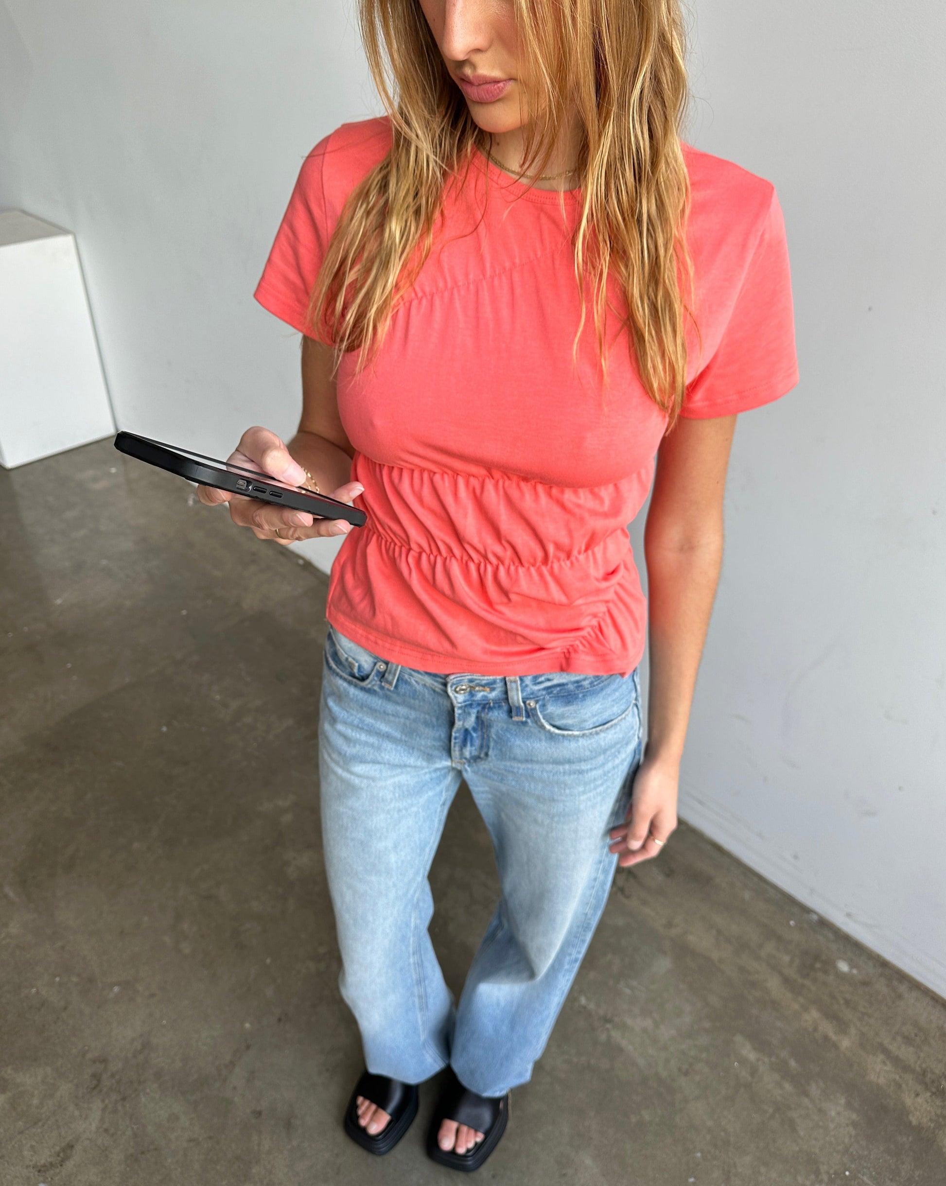 The Scrunched Tee is your new go-to basic, but with a twist! The playful scrunch details give this classic a modern upgrade. It has a relaxed yet slim fit that is incredibly flattering. Made from thick 100% cotton, it feels soft, breathes well, and is extremely comfortable. Perfect for everyday wear!
